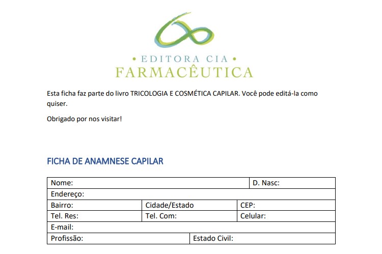 Para aqueles que fazem atendimento de terapia capilar, deixamos aqui uma sugestão de ficha de anamnese, que pode ser adaptada conforme as suas necessidades. Ficha